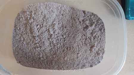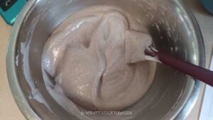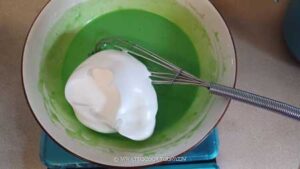 - Weigh the bowl with the meringue in it and then subtract the weight of the bowl. The weight you get now is just the meringue. You can now divide equally by weight into two, one for the black glutinous rice batter and the other for the pandan batter