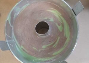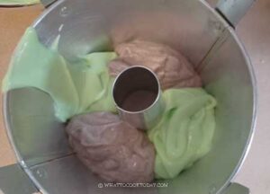 - Pour 1/3 of black glutinous rice batter into an UNGREASED chiffon tube pan, then alternate with the pandan batter and so on until you run out of both