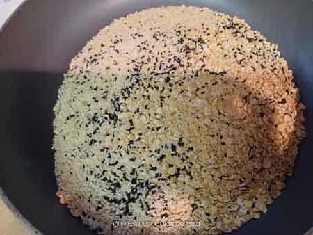 2. In a large dry pan, add oats, unsweetened desiccated coconut, black and white sesame seeds (adds a nice visual contrast). Toast them over medium-low heat, stirring often until they smell really good and nutty, about 5 minutes or so. Remove from the heat and set aside while you prepare other things