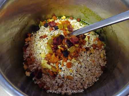 4. Add the toasted dry ingredients and dried fruits into the pan and stir to combine.