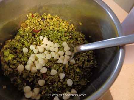 - Add the toasted dry ingredients and dried fruits into the pan and stir to combine. When the mixture is just nicely warm, add the white chocolate chips (you can also use dark chocolate chips if you prefer) and combine. The chocolate will melt a bit, but that's okay