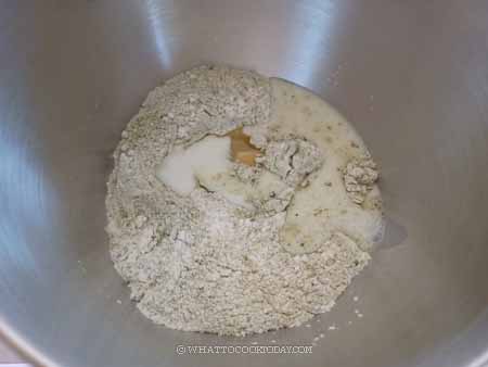 3. Turn the mixer to the lowest speed to let it stir a bit so it won’t fly all over the place. Increase the speed to 2 and knead for about 8 minutes until a dough is formed, but not smooth and flexible yet at this point