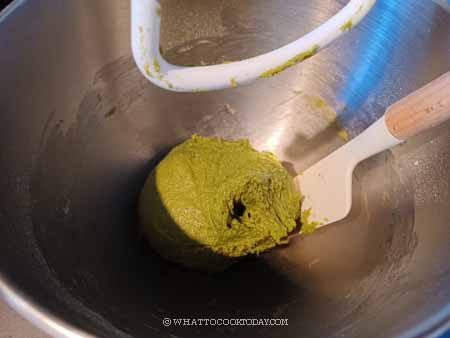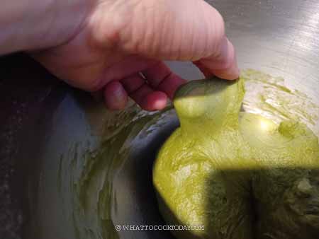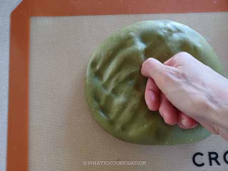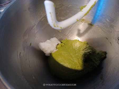 - Combine bread flour, matcha powder, sugar, salt, and yeast in a mixing bowl of a stand mixer fitted with a dough hook attachment. Add condensed milk, milk, and water. Turn the mixer to the lowest speed to let it stir a bit so it won't fly all over the place. Increase the speed to 2 and knead for about 8 minutes until a dough is formed, but not smooth and flexible yet at this point