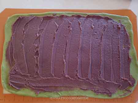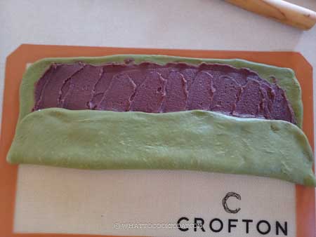 - Roll the dough out into about 8 x 14 inches rectangle. Gently spread the sweet red bean paste on the surface of the dough, leaving about a 1/2-inch border on the edge. Try not to smear too hard as we don't want to tear the dough