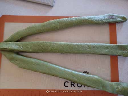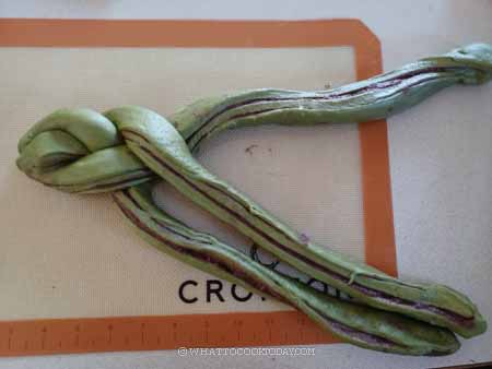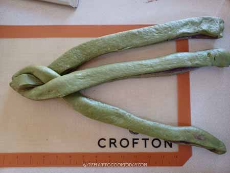 - Separate the three strands as shown in the photos. Move the right strand to the middle, then the left strand to the middle. Expose the cut side up so you can see the beautiful pattern and the color from red bean paste. Repeat this motion, right to the middle, left to the middle. Refer to the photos for better understanding (hopefully!)
