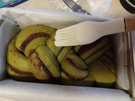 - Prepare the egg wash by mixing the egg with water. Use pastry brush to apply the egg wash on the surface. Sprinkle with some white sesame seeds