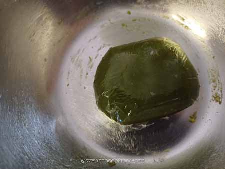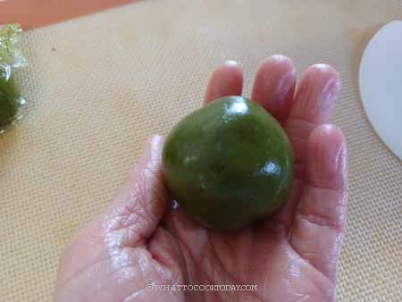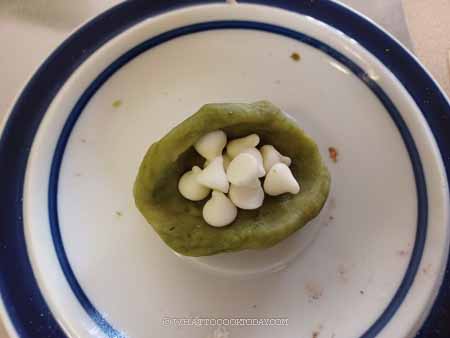 - Add matcha powder to the mung bean paste and mix to combine. Roll the mung bean paste into a round ball. Use your thumb to gently press into the mung bean paste ball. Put the white chocolate chips inside the cavity and roll it back into a round ball again. Repeat with the rest of the mung bean paste and white chocolate chips. Keep them covered to prevent them from drying out