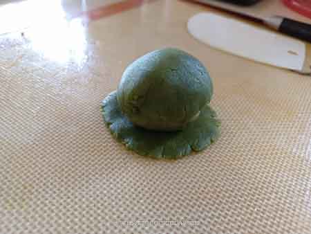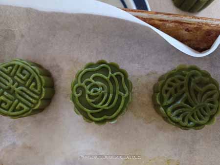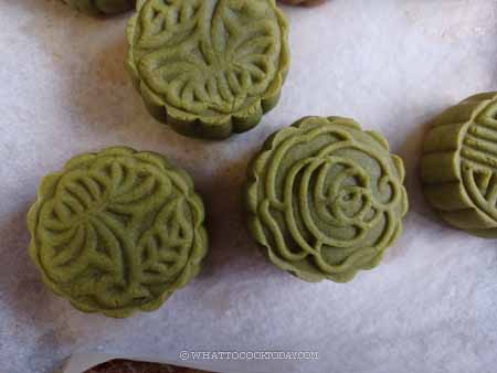 Traditional mooncakes usually use golden syrup and alkaline water in the pastry. I have many successes making mooncakes without golden syrup. I use honey. In this particular recipe, I did not use alkaline water. Alkaline water is usually used to encourage browning in mooncakes. I want no browning in these baked mooncakes because I want the green matcha powder to shine through. When I added alkaline water to the dough, the green matcha powder color changed to really dark and after baking, the color became dull. Even without the golden syrup and alkaline water, the mooncakes still turn out delicious. The pastry is soft and moist.