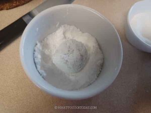 - Fill one small bowl with granulated sugar and another bowl with powdered sugar