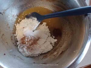 - In another mixing bowl, add sugar and oil and whisk vigorously for a minute or two until the sugar dissolves. You can also use a handmixer to do this. Add the eggs , one at a time, and vanilla extract, and whisk until the mixture emulsified