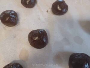- Remove the dough from the fridge. Scoop a dough to form about 1-inch dough ball. Roll it into a round dough ball with your palms. Place the dough ball on the prepared baking sheet, about 2 inches apart as the cookie spreads