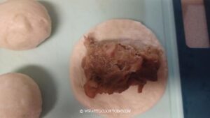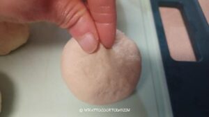 - Round each dough into a dough ball and cover them with a cling wrap and let it rest for about 5 minutes to relax the gluten. Work with one dough at a time. Flatten one piece of dough with your palm or a rolling pin to about 4 inches in diameter. Put the filling in the center.