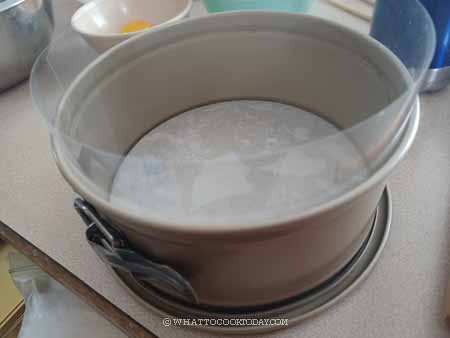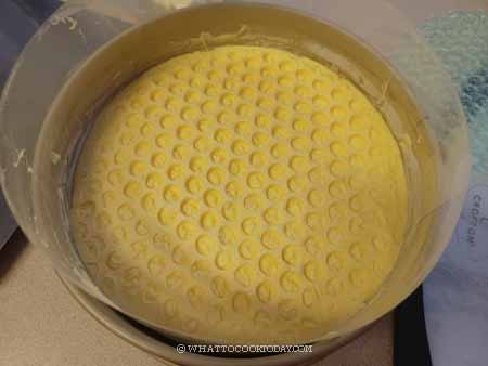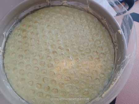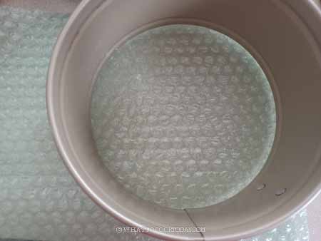 14. Get the cake out from the fridge and gently peel off the bubble wrap you put on top of the cake earlier. Release the springfoam ring and the acetate sheet (if using)