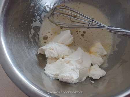 - Put egg yolk, honey, mascarpone cheese, lemon juice in a heat-proof bowl that can sit on top of a saucepan. We are going to set up a double boiler. Fill up the saucepan with about 1-2 inches of water, make sure the bottom of the bowl won't touch the water. Bring the water to a simmer over low-medium heat. Set the bowl on top and keep whisking until the cheese and sugar melts. Add the bloomed gelatin and keep stirring until dissolves. Remove from the heat