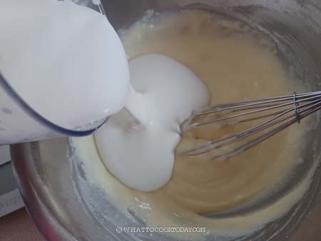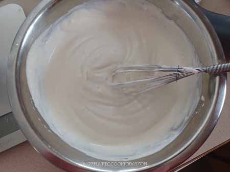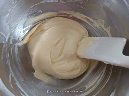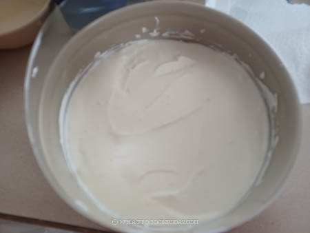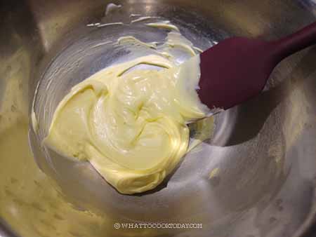 4. Put egg yolk, honey, mascarpone cheese, lemon juice in a heat-proof bowl that can sit on top of a saucepan. We are going to set up a double boiler. Fill up the saucepan with about 1-2 inches of water, make sure the bottom of the bowl won’t touch the water. Bring the water to a simmer over low-medium heat. Set the bowl on top and keep whisking until the cheese and sugar melt. Add the bloomed gelatin and keep stirring until dissolves. Remove from the heat