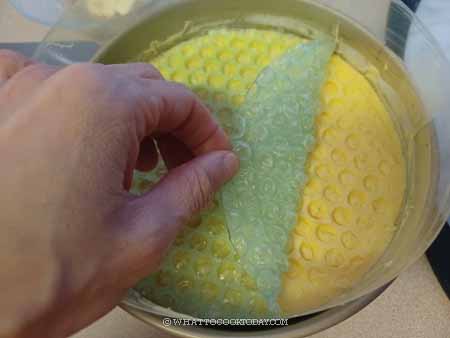 - Put a drop or two of yellow food coloring into the rest of the cheese mixture. When the white mousse layer has hardened, pour the yellow layer on top. Gently put the cut-out bubble wrap, the texture side facing down, the smooth side facing you. Very gently press it on top of the yellow mousse. Just a gentle touch!
