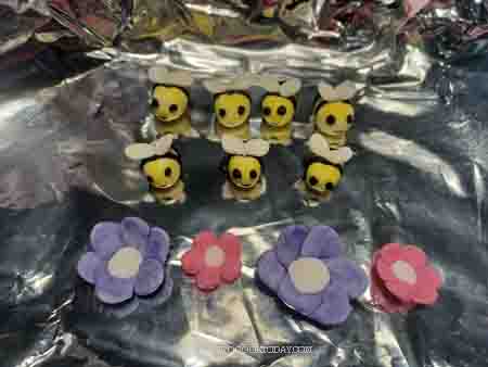 - I use ready-made fondant to make the bees and flowers the day before and let them dry overnight