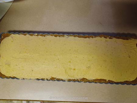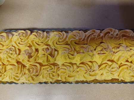 - Spread half of the mousse filling into the pan. Smooth the surface out with an offset spatula. Transfer the other half in a piping bag fitted with a nozzle of your choice. Pipe some decorative flowers on top. Alternatively, you can just fill the pan with all the mousse filling without decorative piping if you choose to do so