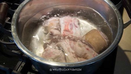 - Bring a large pot of water to a boil. Add the trotters and hocks and boil for about 5 minutes. You will see some scums rising. Discard those. Drain off all the water and rinse the trotters and hocks with clean water to get rid of scums