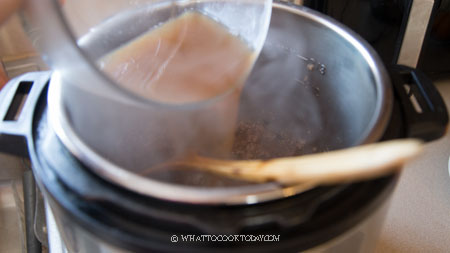 5. I use Instant Pot pressure cooker to make this dish. Press saute. When it’s hot, add the cooking oil and the paste you grind earlier. Saute until fragrant, about 3 minutes or so
