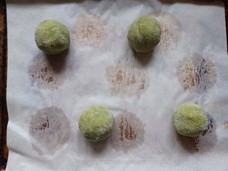 7. Combine sugar with matcha powder. I didn’t use the matcha powder for coating because my kids find it a bit bitter (though the adults won’t mind it). They don’t mind it when the matcha powder is mixed into the dough