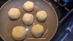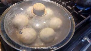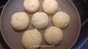 - Carefully pour about 1/4 cup of water into the pan. It will sizzle a lot. Immediately cover the lid. You can lower the heat a little bit and let them steam for about 4-5 minutes, or until the buns expand and puff up