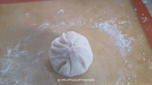 - Gather the sides to enclose the bun and pinch to seal. Flip the bun so the seam side is down now if you want a smooth top, or leave the seam up for a "pleated" look
