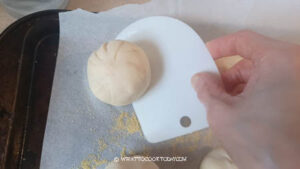 - Use a dough scraper on one hand to help you pick up the proofed buns, trying not to deflate the dough too much, and place on the pan