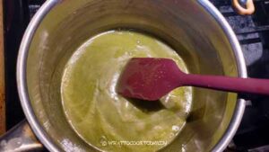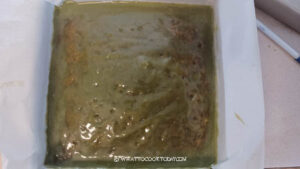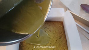- 10 minutes before the end of baking time, prepare the glaze. Combine light brown sugar,coconut milk, pinch of salt, pandan juice, cornstarch. Whisk until they are combined
