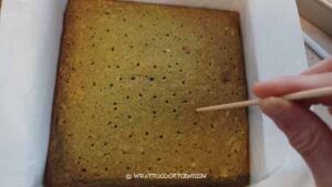 - As soon as the cake is out of the oven, put it on a cooling rack. Use a fork or a skewer to poke holes halfway into the cake, all over the surface.