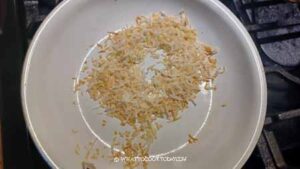 - Put the coconut on a dry pan over low heat and stir until they are lightly golden brown.