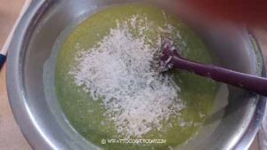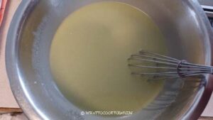 - Combine oil, egg, coconut milk, pandan juice, pandan essence (if using), apple cider vinegar. Whisk until mixture is smooth and emulsified