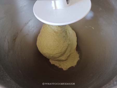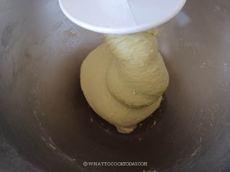 3. I use a 9 x 9 inch square pan. I baked 9 buns in there and 3 in a mini loaf pan. You can use large baking pan to fit them all. Line them with a parchment paper for easy removal. Tear the sweet stiff starter into pieces and add pandan essence into the dough for sourdough version. Add all ingredients for the dough except for the butter. Use the dough hook to stir the mixture a bit so the flour won’t fly around when you start the mixer. Knead on the lowest speed for 2-3 minutes and then increase to speed 2 and knead for 3 minutes and then speed 4 for another 3 minutes or until it forms a dough that clears the side of the bowl, but not smooth yet