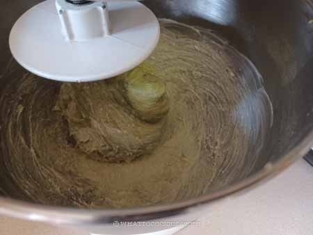 - Add all ingredients for the dough except for the butter. Tear the sweet stiff starter into pieces and add into the dough and add pandan essence for sourdough version. Use the dough hook to stir the mixture a bit so the flour won't fly around when you start the mixer. Knead on the lowest speed for 2-3 minutes and then increase to speed 2 and knead for 3 minutes and then speed 4 for another 3 minutes or until it forms a dough that clears the side of the bowl, but not smooth yet