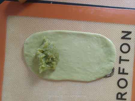 7. Work with one dough at a time. Take one piece of dough and roll it out into roughly a rectangle, about 6 inches long and about 4 inches wide. Put about one tablespoon of kaya filling near the top