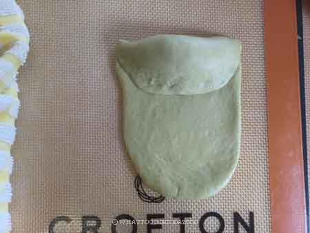 - Refer to the photos above for visual if necessary. Work with one dough at a time. Take one piece of dough and roll it out into roughly a rectangle, about 6 inches long and about 4 inches wide. Put about one tablespoon of kaya filling near the top, then fold the top part over to enclose the kaya filling. Fold the two sides in. Pinch slightly to seal. Use a pizza cutter or a bench scraper to cut the rest of the dough into strips. Roll the dough down to form an-oval shaped bun.