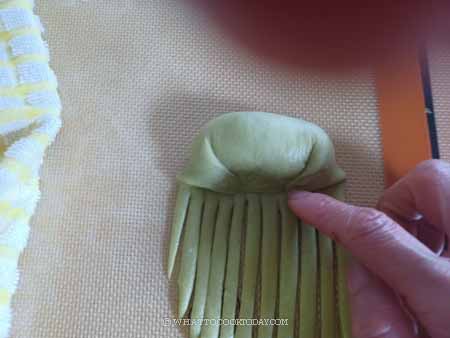 8. Fold the top part over to enclose the kaya filling. Fold the two sides in. Pinch slightly to seal. Use a pizza cutter or a bench scraper to cut the rest of the dough into strips.