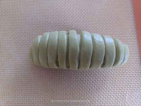 10. Place it diagonally on a prepared pan. You can place it however you want. Repeat with the rest of the dough and the kaya filling