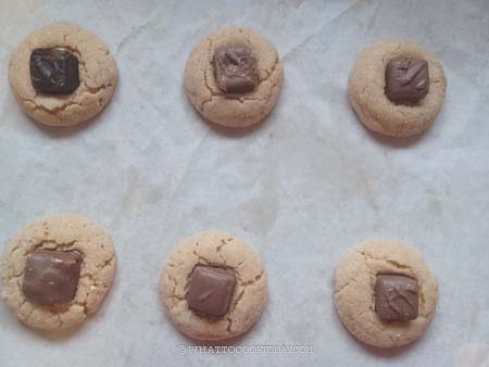 - Immediately when they are out of the oven, press the chocolate pieces or miniature candy bar on top of each cookie. They are still very very soft at this point, and that's how it should be. When the chocolate is still melty from the warm cookies, I added some crushed peppermints on top (this is totally optional)