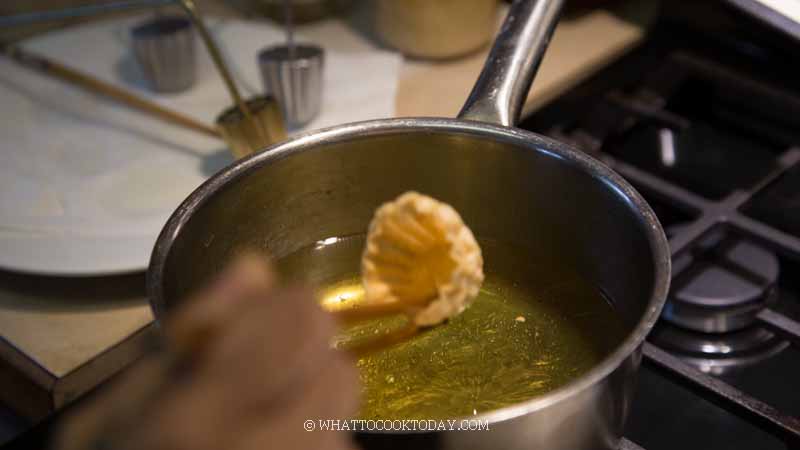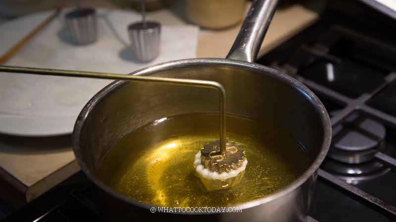 Preheat about 3 inches of oil. Dip the pie tee mould in the oil to preheat it. This step is to avoid the batter sticking to the mould while you fry later