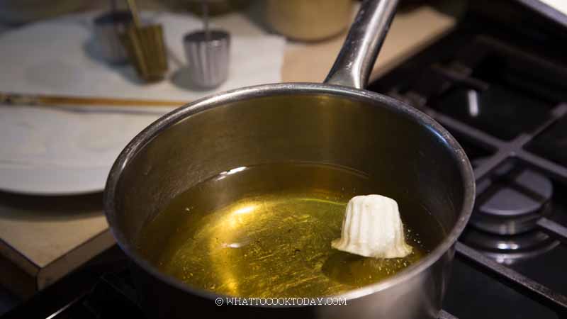 - Once you dip in the batter, quickly dip the mould into the oil to fry. Do not move it or try to remove the shell just yet. Let it fry until golden brown and then when you move the mould up and down, the shell will release itself and let it continue to fry until golden brown. If the shell is stuck, you can use a skewer or a chopstick to help release the shells