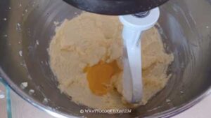 - Add the eggs and the egg yolk, one at a time.