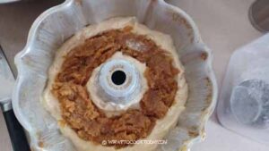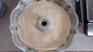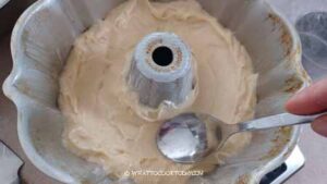 - Grease the bundt pan with butter and then coat with flour evenly all over the pan. Tap out any excess flour. Keep the pan in the fridge. This is to prevent the cake from sticking to the pan. I use a homemade cake goop. It works so well with any recipe that requires that I grease the baking pan.
