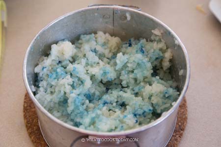 3. Dot the rice with some blue colors you extracted from blue pea flowers. This is optional. Let the rice cools down completely before wrapping