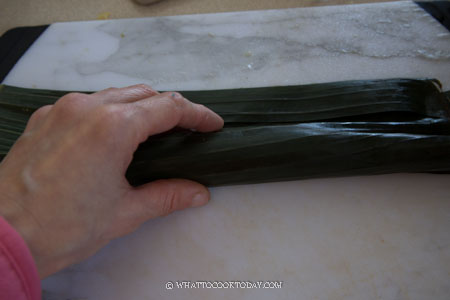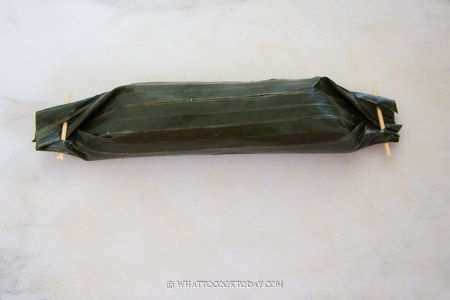 6. Use the banana leaves to help you fold the rice over to cover the filling and continue to roll over to the other side. Make sure the roll is nice and tight