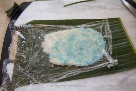 - Soak the rice for at least 4 hours or overnight. Discard soaking water and transfer to a steaming tray. Bring water in the steamer to a boil. Spread the rice out and add coconut milk, water, salt, and sugar. Stir to combine. Add pandan leaves and kinda push them into the rice. Steam the rice on high heat for 25-30 minutes. Discard pandan leaves. Dot the rice with some blue colors you extracted from blue pea flowers. Fluff the rice and let it cools down before wrapping
