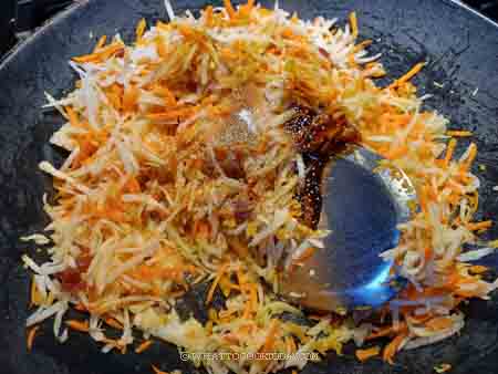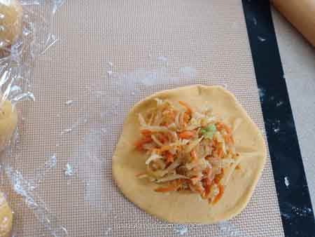 2. Add the yam bean, carrots and seasonings. Saute until the beans and carrots are soft. Cook until the filling is dry an no longer soupy. Have a taste and adjust seasonings to your preference. Off the heat