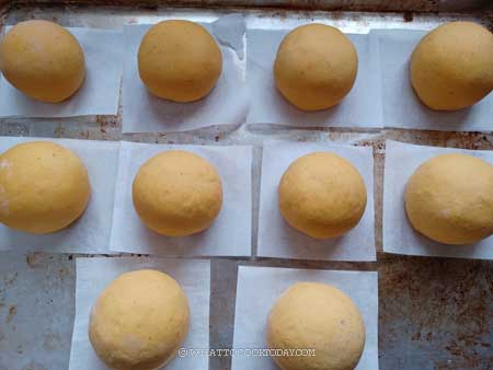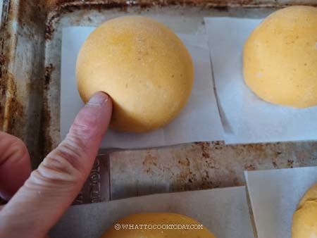 10. Let the dough rise at room temperature or at a warm place. If it’s winter where you are, you can use your oven “bread proof” function to let them proof in there, or simply turn on your oven to the lowest temperature and then turn off and after 15 minutes, place the shaped buns in there to let them proof. They won’t necessarily double in size, but at least puff up to about 50% of the original size. This may take about 1 hour or longer at a warm temperature. Don’t go by the time however. Observe the dough instead!