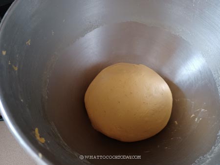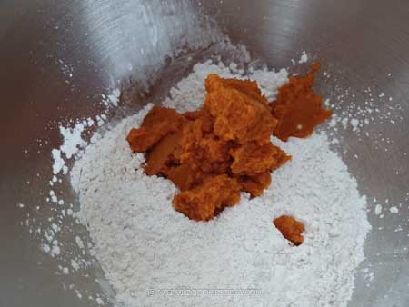 4. Prepare the dough. Place all the ingredients for the dough in a mixing bowl of a standmixer fitted with a dough hook attachment. If it feels dry, add water, 1 teaspoon at a time. How much water is needed really depends on the pumpkin puree. I used canned pumpkin puree, which has less water. If you use homemade pumpkin puree, you may not need to add additional water. If the dough feels too wet, add a bit more cake flour as needed, one tablespoon at a time.