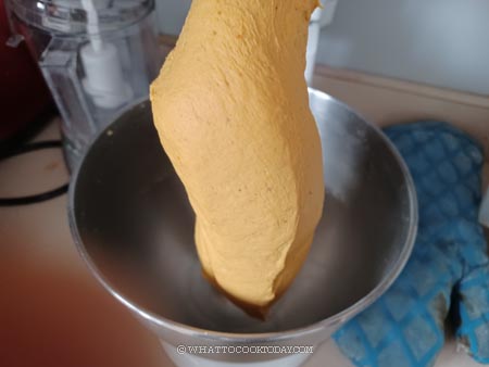 - Place all the ingredients for the dough in a mixing bowl of a standmixer fitted with a dough hook attachment. If it feels dry, add water, 1 teaspoon at a time. How much water needed really depends on the pumpkin puree. I used canned pumpkin puree, which has less water. If you use homemade pumpkin puree, you may not need to add additional water. If the dough feels too wet, add a bit more cake flour as needed, one tablespoon at a time. The dough should feel soft and just slightly sticky to the touch. Knead on medium speed until the dough is smooth.